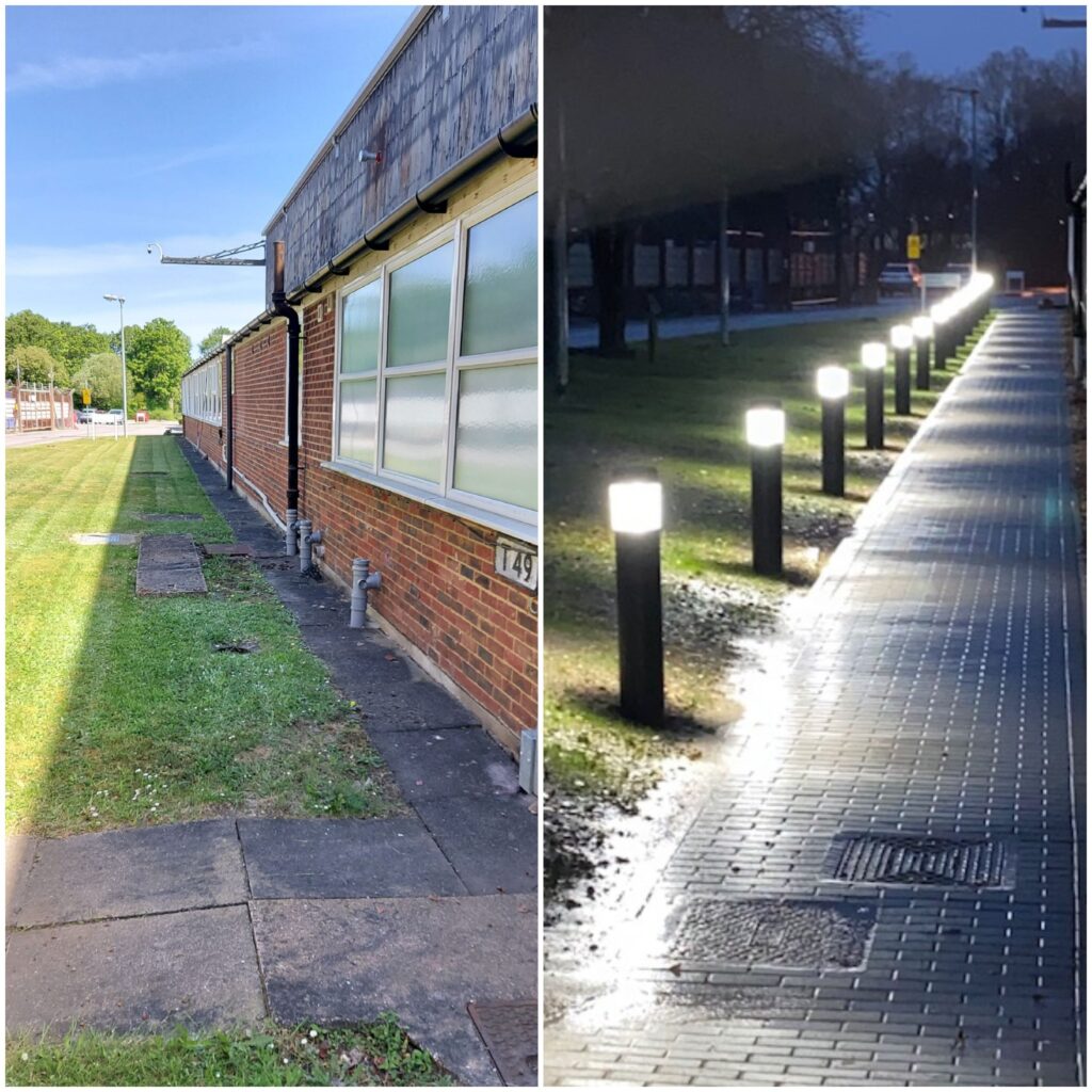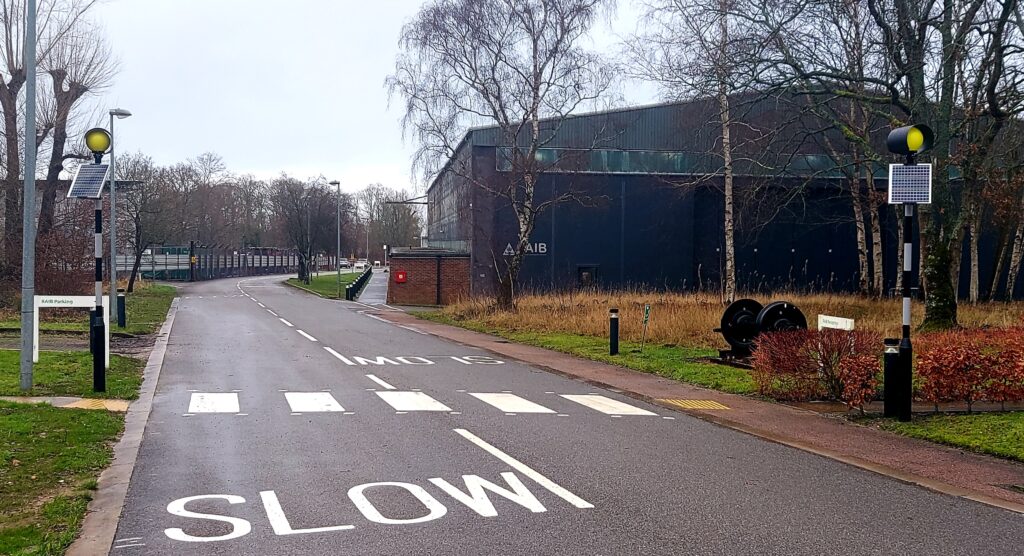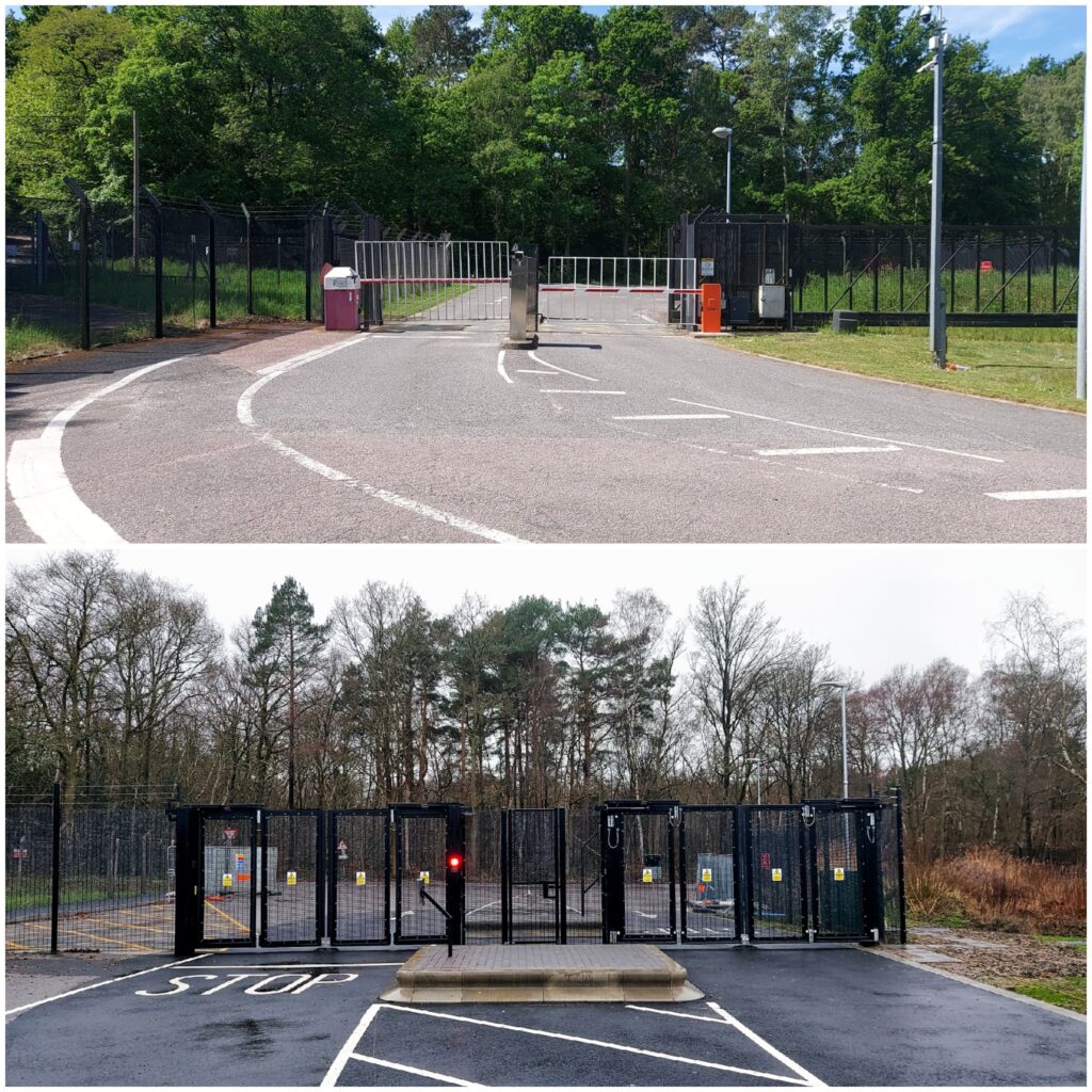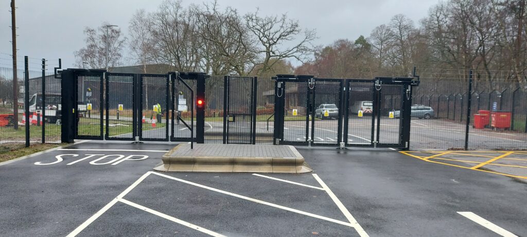 Scope of Works: Remove the existing entrance drop arm barriers, install new 2no. Bi-fold Gates Speed gates and reconfigure existing entrance road layout. Install new pedestrian footpath with LED bollards and associated painted pedestrian crossings complete with Solar Belisha Beacons, drop kerbs and hazard tactile warning paving.