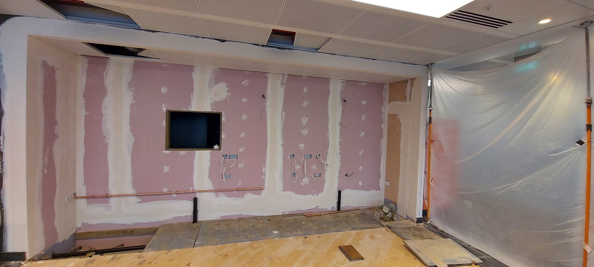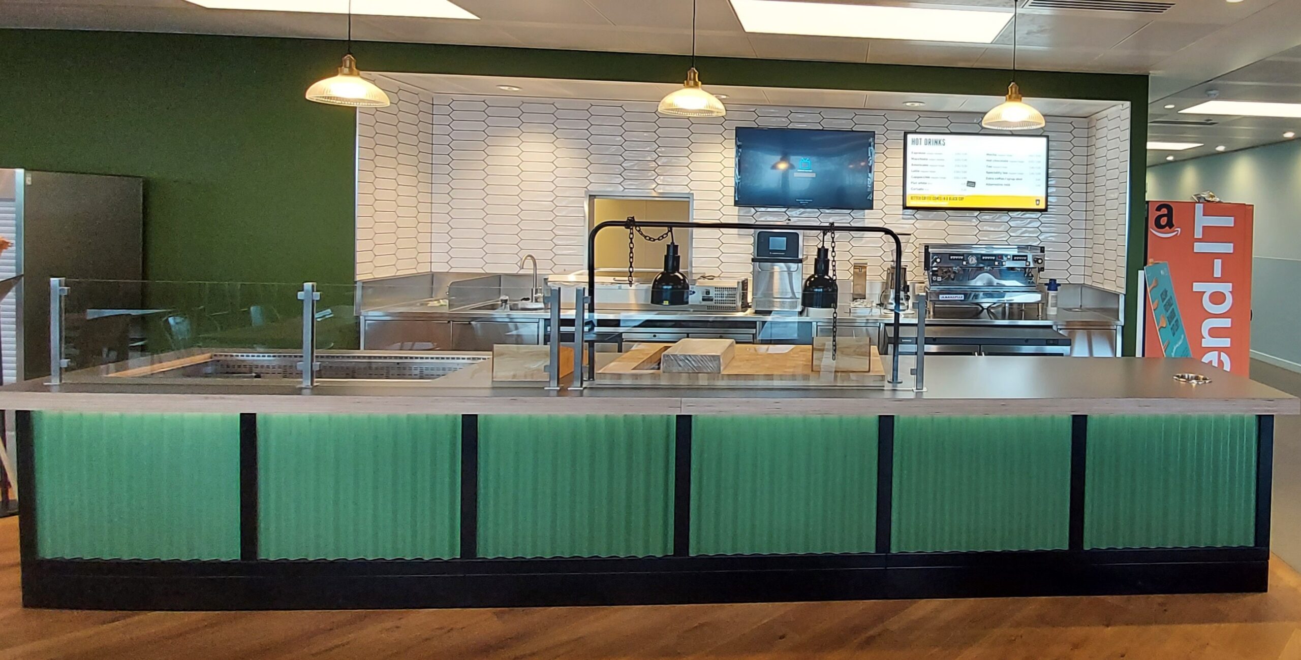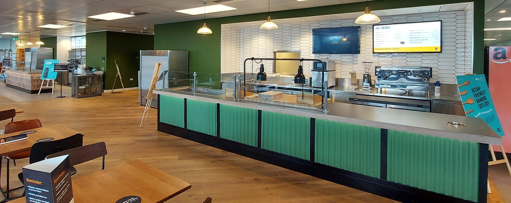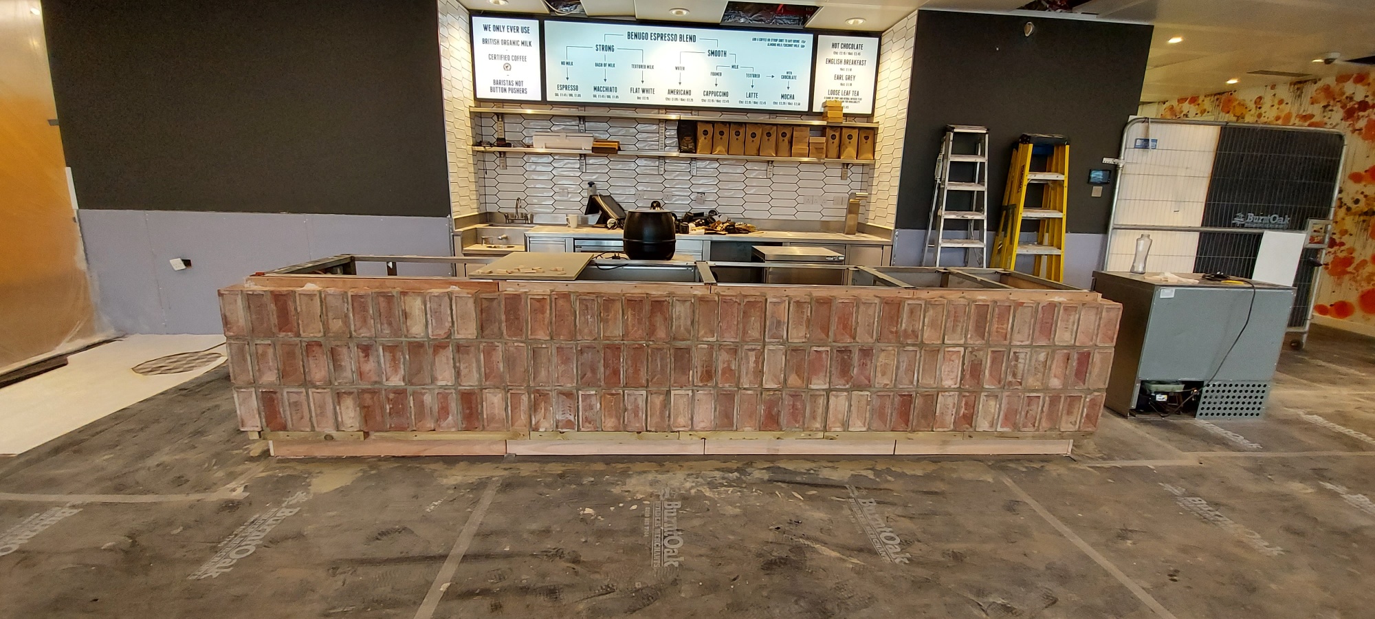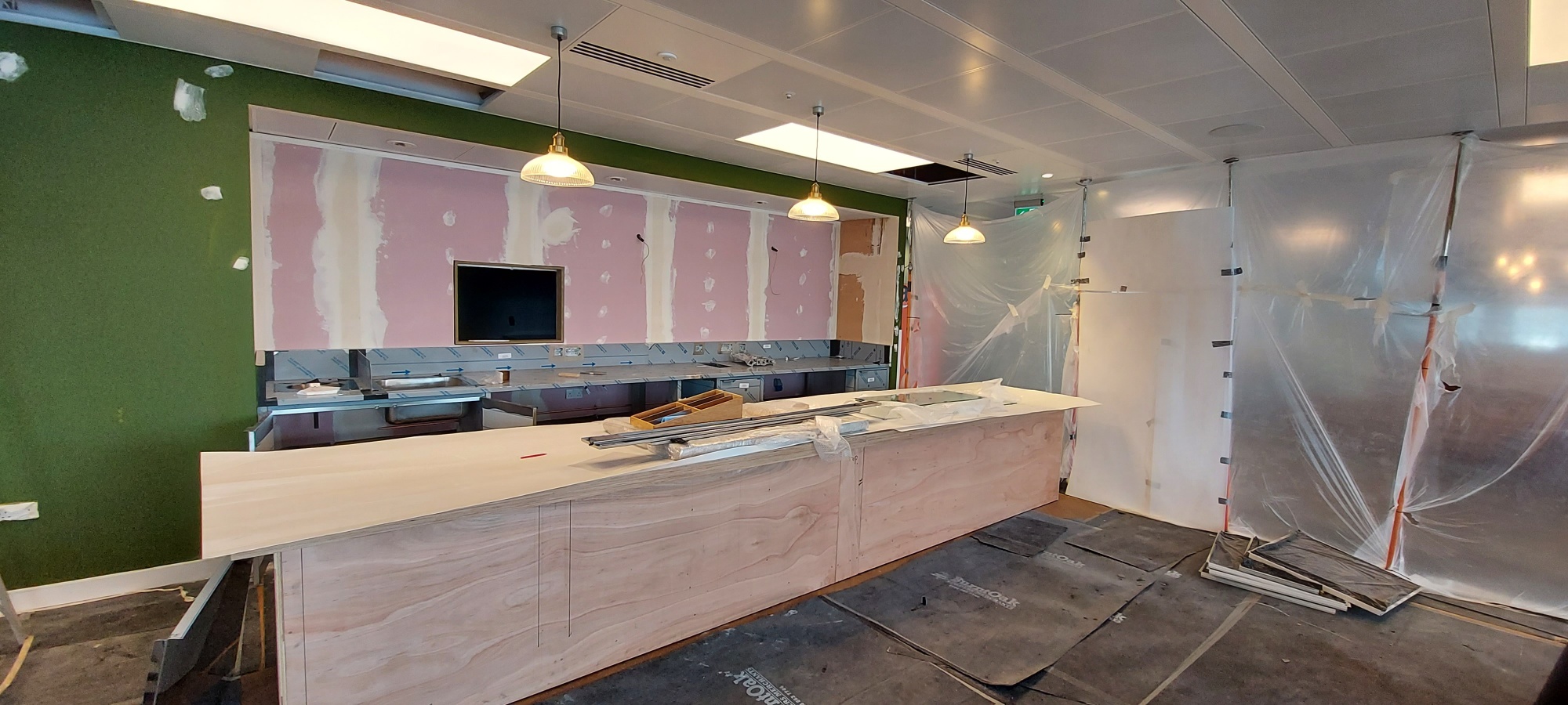 1st floor – Demolition of walls and strip out of wall M&E services, finishes and large salad bars. Installation of new grab and go fridges, hot plates and mobile salad bars. New LED lighting and power, touch screen ordering tablets and data, waste and water connections, installation of a new bespoke cooking pods, installation of new ovens, hot plates, new luxury timber cladding and vinyl flooring. Decoration to new and existing walls, decorative tiling.